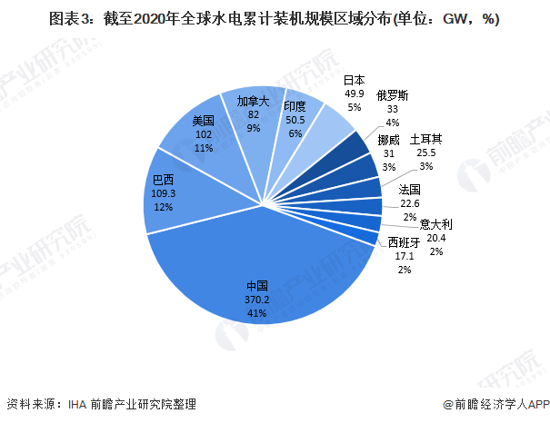 从不同地区的装机规模来看,截至2020年末,中国的水电装机规模稳居全球首位,达370.2GW,占比达41%: