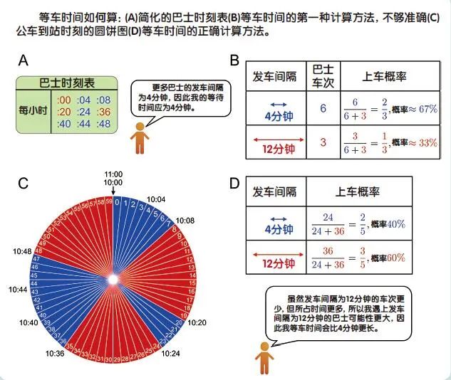 这就解释了为什么公交车明明准点发车,乘客却苦苦等不到车的原因:当有一辆车到达时间晚点时,人们的平均等待时间会变长。而且,由于多数人会出现在等待时间更长的时段里,也就会有更多人感觉自己的等车时间很长。