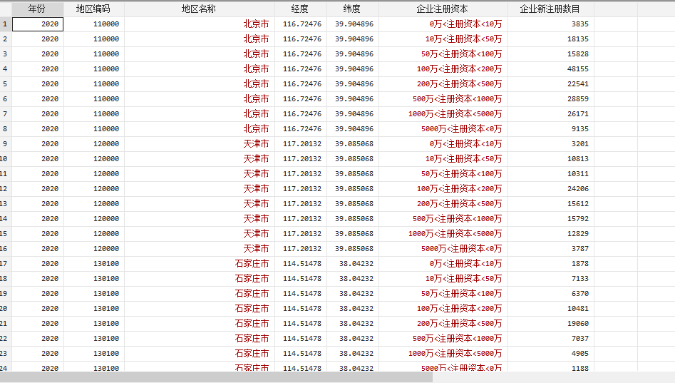 利用爱企查的高级检索,选择注册资本、地区、年份,对各地区的新注册企业数目进行统计