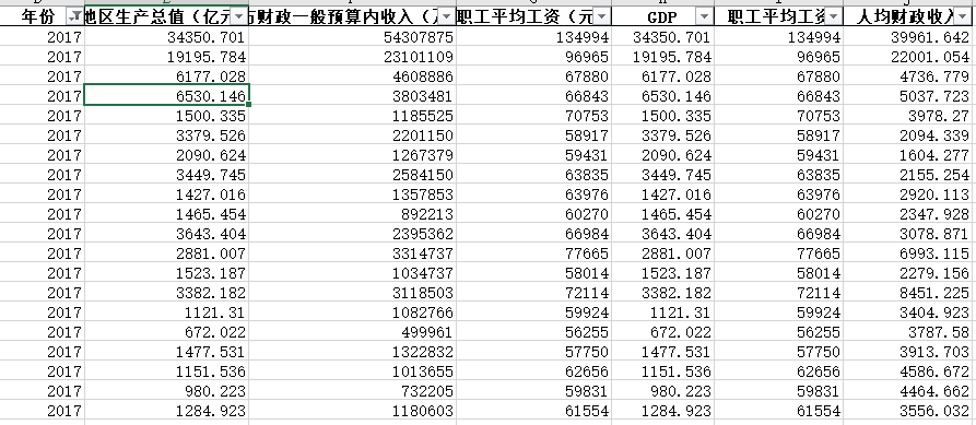数据说明:地区生产总值(亿元)、地方财政一般预算内收入(万元)、职工平均工资(元)、GDP、职工平均工资、人均财政收入