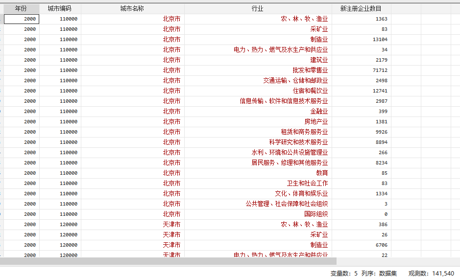 年份、城市编码、城市名称、所属行业、新注册企业数目