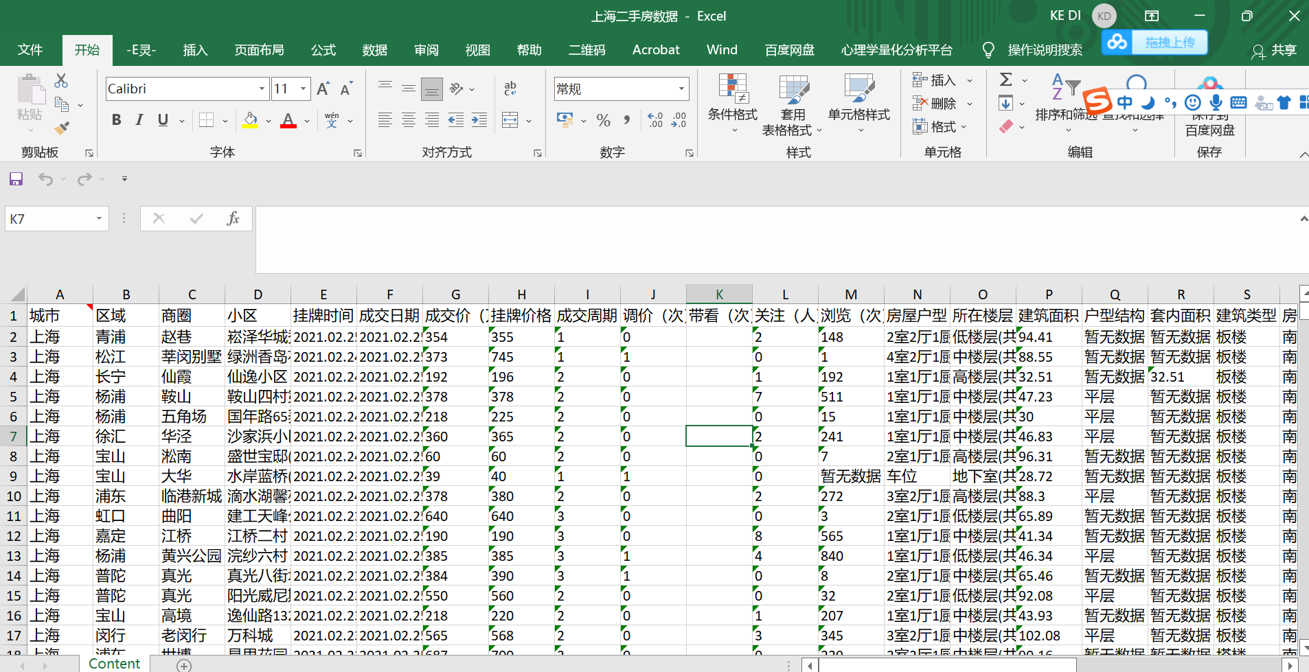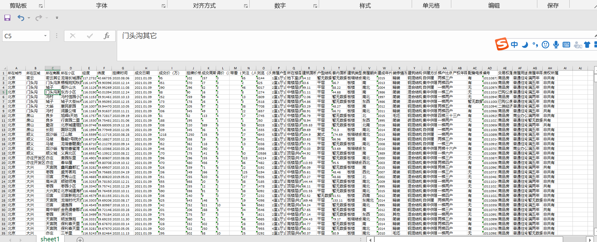 城市 区域 商圈 小区 挂牌时间 成交日期 成交价(万) 挂牌价格(万) 成交周期(天) 调价(次) 带看(次) 关注(人) 浏览(次) 房屋户型 所在楼层 建筑面积(㎡) 户型结构 套内面积(㎡) 建筑类型 房屋朝向 建成年代 装修情况 建筑结构 供暖方式 梯户比例 产权年限 配备电梯 编号 交易权属 房屋用途 房屋年限 房权所属 经度 纬度