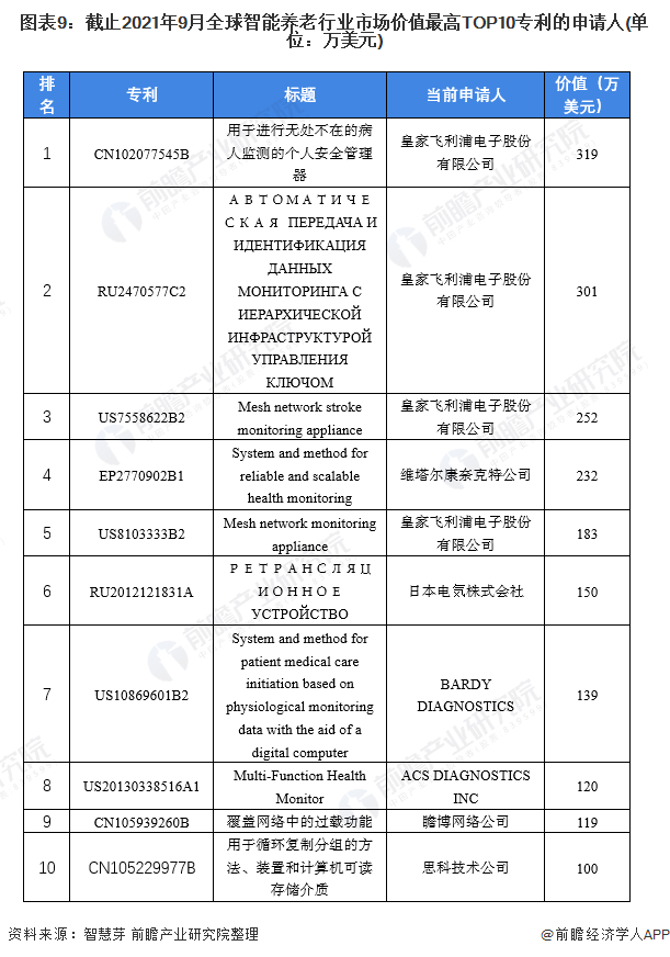 全球智能养老市场价值最高TOP10专利中,有4席由皇家飞利浦电子股份有限公司占据,并且皇家飞利浦电子股份有限公司拥有全球智能养老市场价值最高的专利,为319万美元。