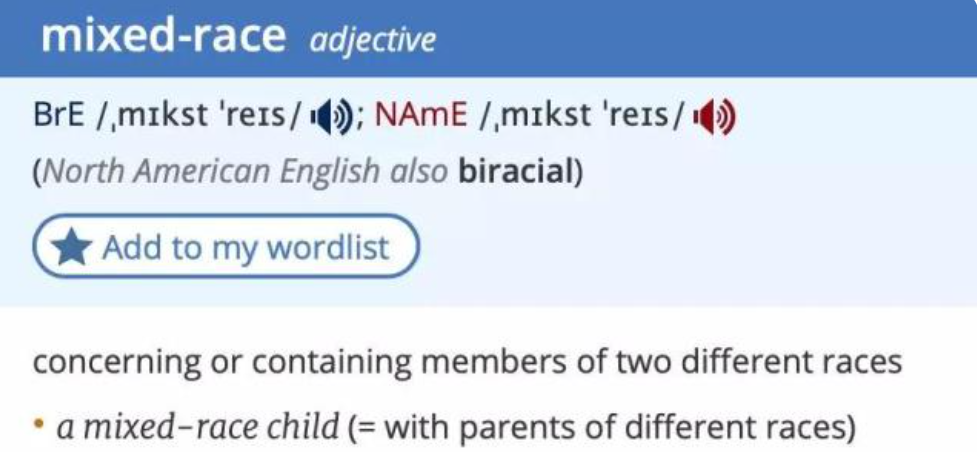 根据牛津词典的释义,mixed-race是形容词,表示“混血的”。
