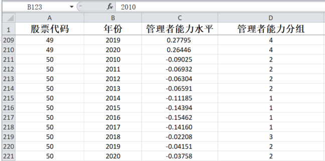 参考Demerjian(2013)、姚立杰等(2020)、王艳艳(2020)等学者,基于模型残差衡量管理层能力,残差由小到大表示管理层能力由弱到强。并且,将回归残差从小到大排序分为四组,相应的把管理者能力 ( MA) 赋值为 1、2、3、4 来衡量,赋值越高,代表管理者能力越强!