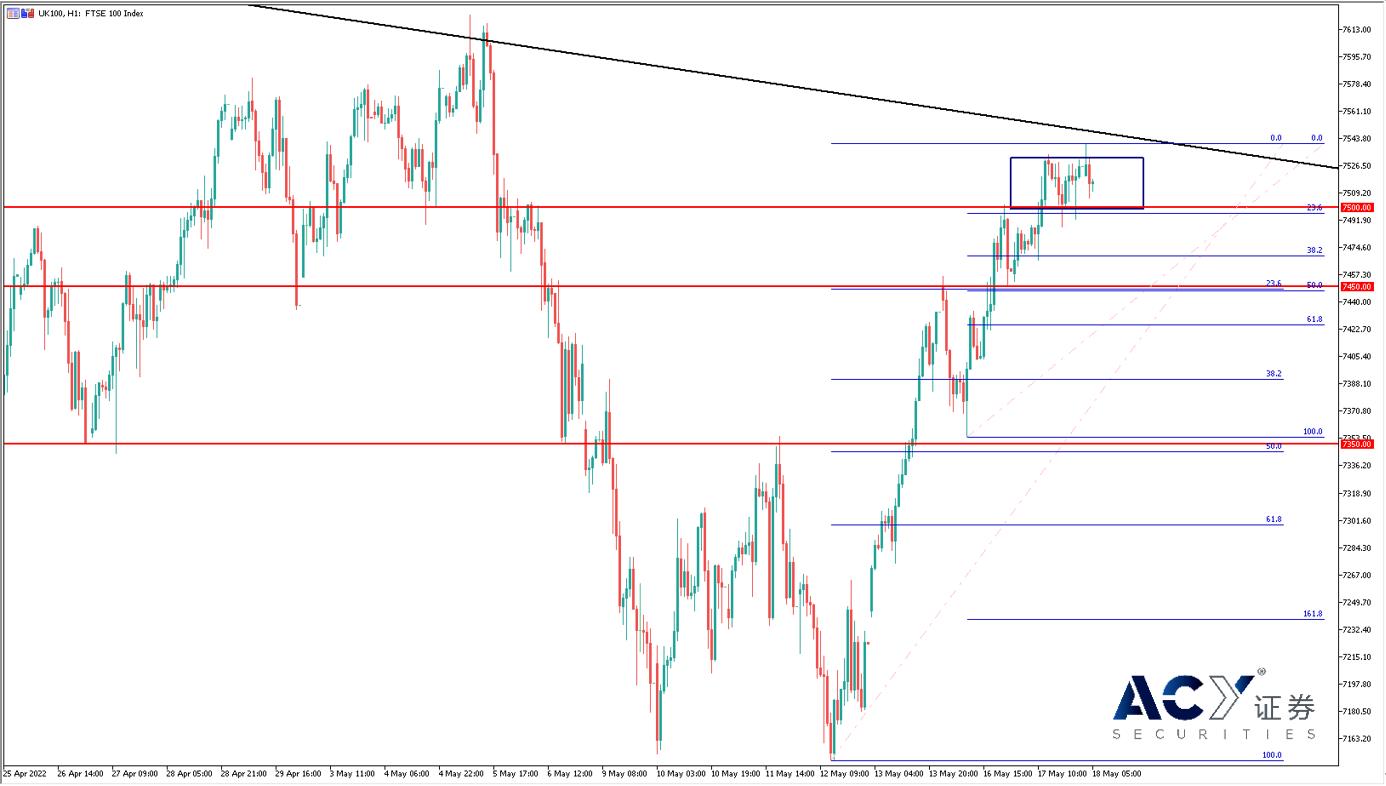 从英国指数小时图来看,美元回调带动全球股市反弹,英国股市的反弹力度尤为惊人,呈现单边上涨的行情。英镑本周的大涨并未阻碍多头入场。不过现价上方是长线下降趋势,存在技术面的阻力效果。考虑到美元跌势并不稳定,长线投资仍有一定风险。因此交易策略以逢低做多为主,可以配合金字塔结构进行分批入场。日内支撑在7500附近,再下方则要看7450和7350关口,这两个位置是多重斐波那契回调线、涨平涨中继形态以及底部颈线的共同支撑结构,有着非常强的支撑力量,值得中长线投资者关注。