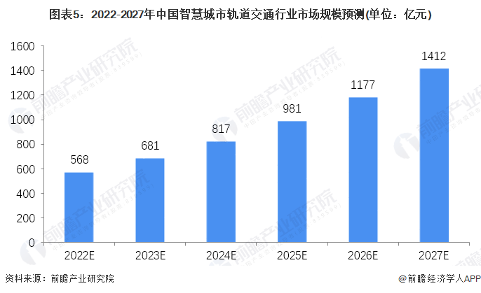 根据前瞻产业研究的分析,随着智慧城市建设、城市轨道交通建设等需求的共同推动下,未来我国城市轨道交通智慧化需求将持续增长,预计2022-2027年城市轨道交通智慧化市场规模保持20%的增速,到2027年城市轨道交通智能化的市场规模达到约1412亿元。