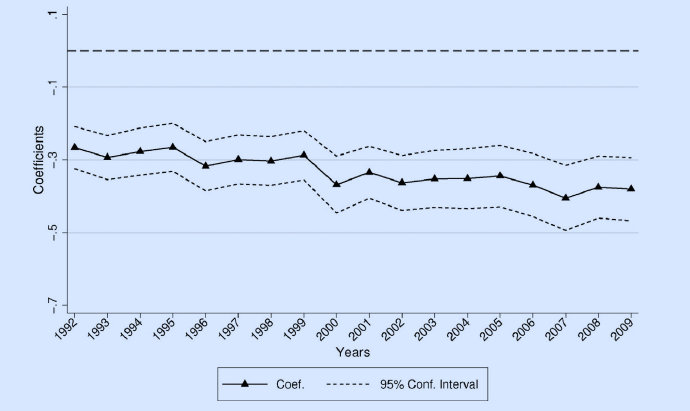 我想跑10个回归y=a+bx+e,每个回归都是在总样本中删除不同数量样本,我想把b1 b2.....b10 的系数和置信区间画在同一幅图上,类似下图,请问哪里有代码可以学习呢?