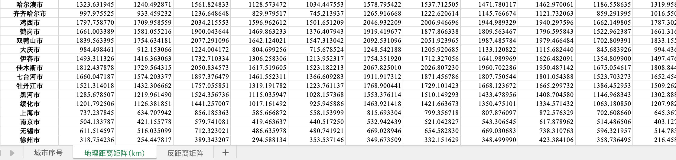 (1)地理距离矩阵,单位是km,使用matlab计算。两城市间的地理距离是通过经纬度计算出来的。