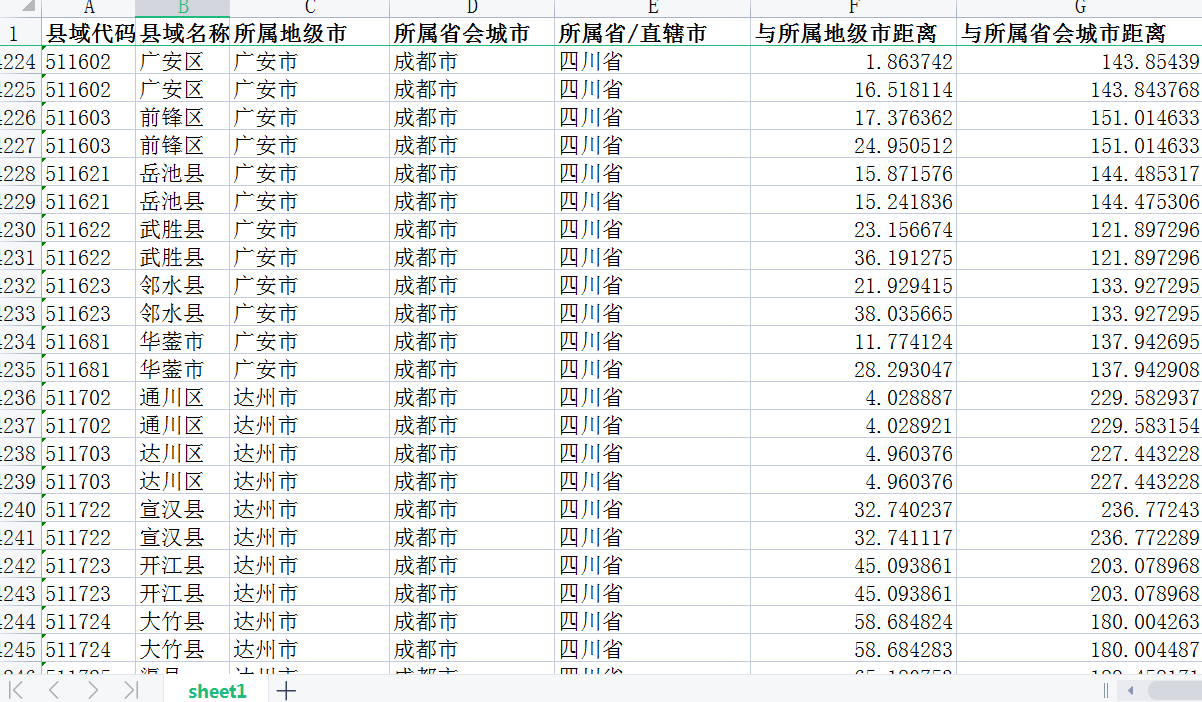 县域代码、县域名称、所属地级市、所属省会城市、所属省/直辖市、与所属地级市距离、与所属省会城市距离、与所属直辖市距离。