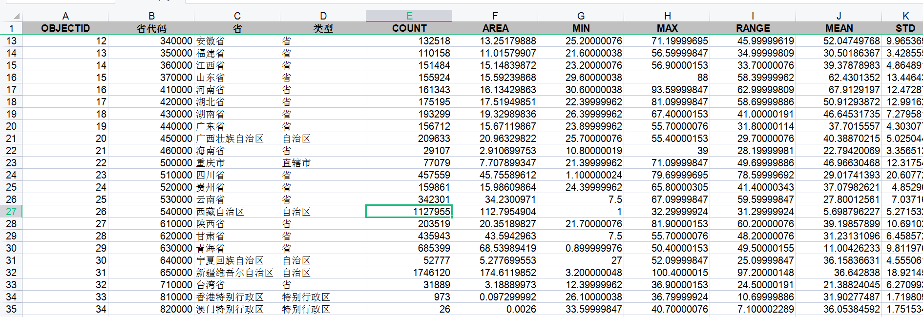 数据指标:区域名、区域代码、区域面积、PM2.5最小值、最大值、极差、均值、标准差、年度总值