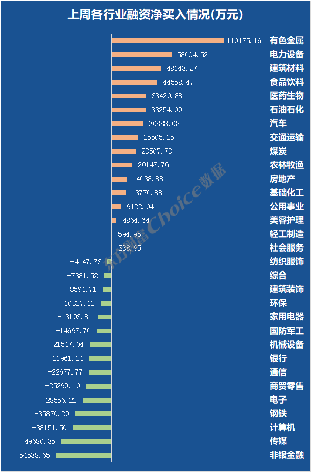 从行业分布来看,截至5月20日,上周(5.16-5.20)融资净买入排名前五的行业分别是有色金属、电力设备、建筑材料、食品饮料和医药生物。