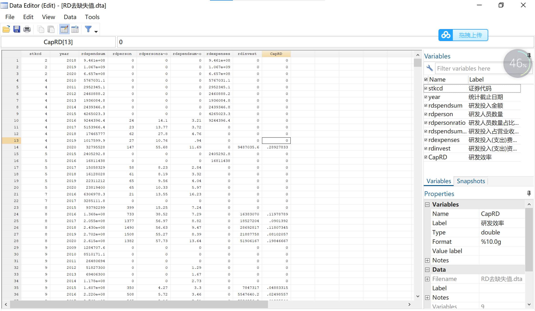 rdspendsumratio | 研发投入占营业收入比例(%) |