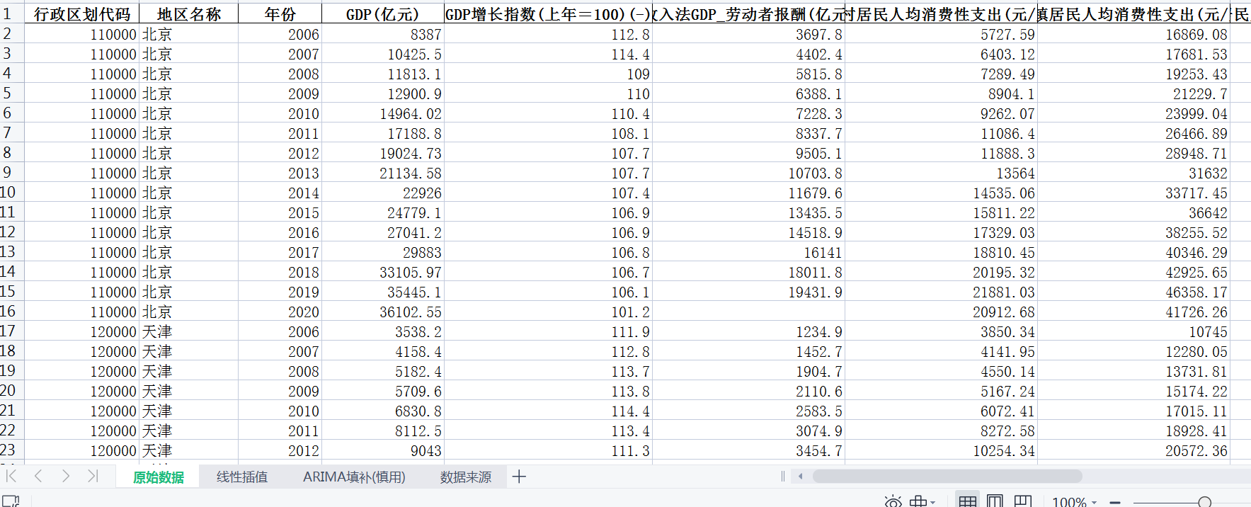 数据整理:内含原始版本、线性插值、ARIMA填补版本,计算公式在文件中有详细说明