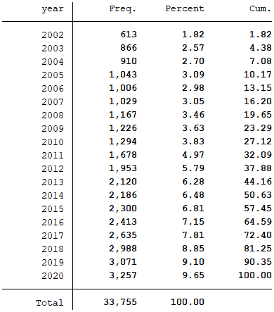 样本选择:全部A股2002-2020年数据(初始数据是从1990年开始,经过处理之后的数据起点为2002年)