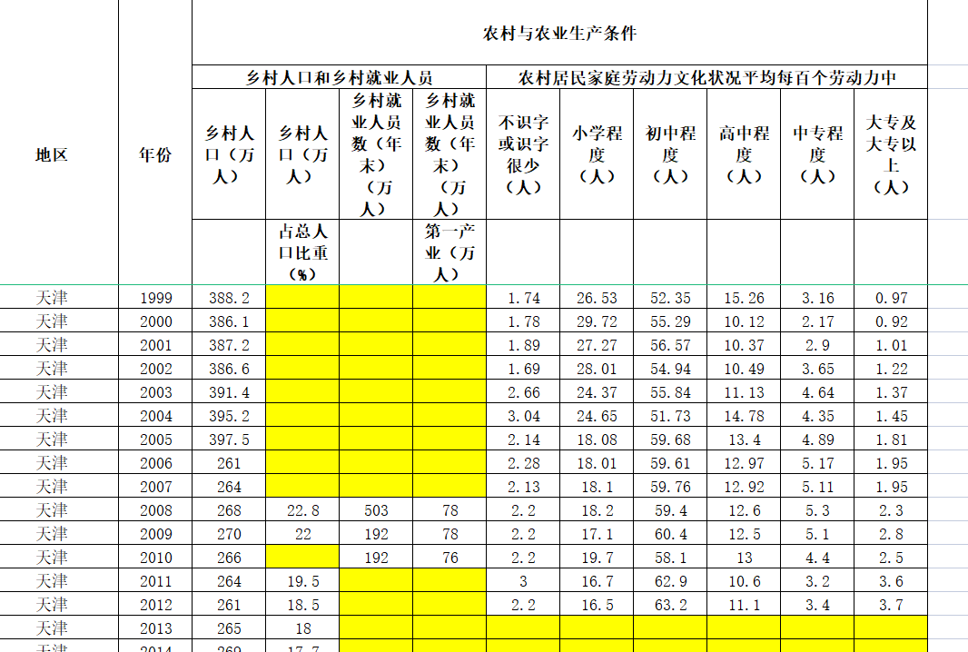 农村居民家庭劳动力文化状况平均每百个劳动力中:不识字或识字很少(人)、小学程度(人)、初中程度(人)、高中程度(人)、中专程度(人)、大专及大专以上(人)