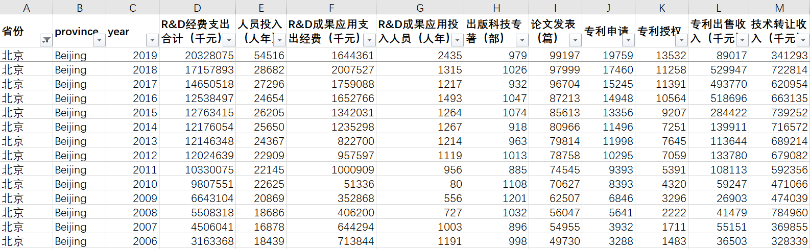2006-2019高等学校科技统计资料 分区域R&D投入与产出相关指标
