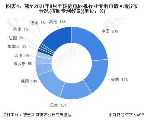 从全球主要地区脑电图机专利申请数量来看,截至2021年8月,中国专利申请数量占比最高为23%,其次是美国占比17%、韩国占比14%。近几年,中国的脑电图机专利申请数量规模高速增长,目前国内的相关专利申请数量已经超过美国、日本、韩国等发达国家,有助于推动国内脑电图机研发制造水平快速提升。