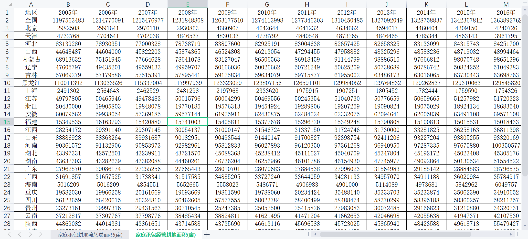 数据内容:2005-2019年全国及各省(不含西藏)家庭承包耕地流转总面积、全国及各省家庭承包经营耕地面积。由这两个指标可计算分省土地流转率。