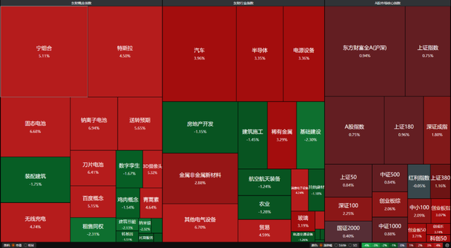 “板块热图”功能提供七大可选板块,分别为【东财概念指数】、【东财行业指数】、【A股市场核心指数】、【申万一级、二级行业指数】和【中信一级、二级行业指数】,用户可自由选择板块进行热图跟踪。