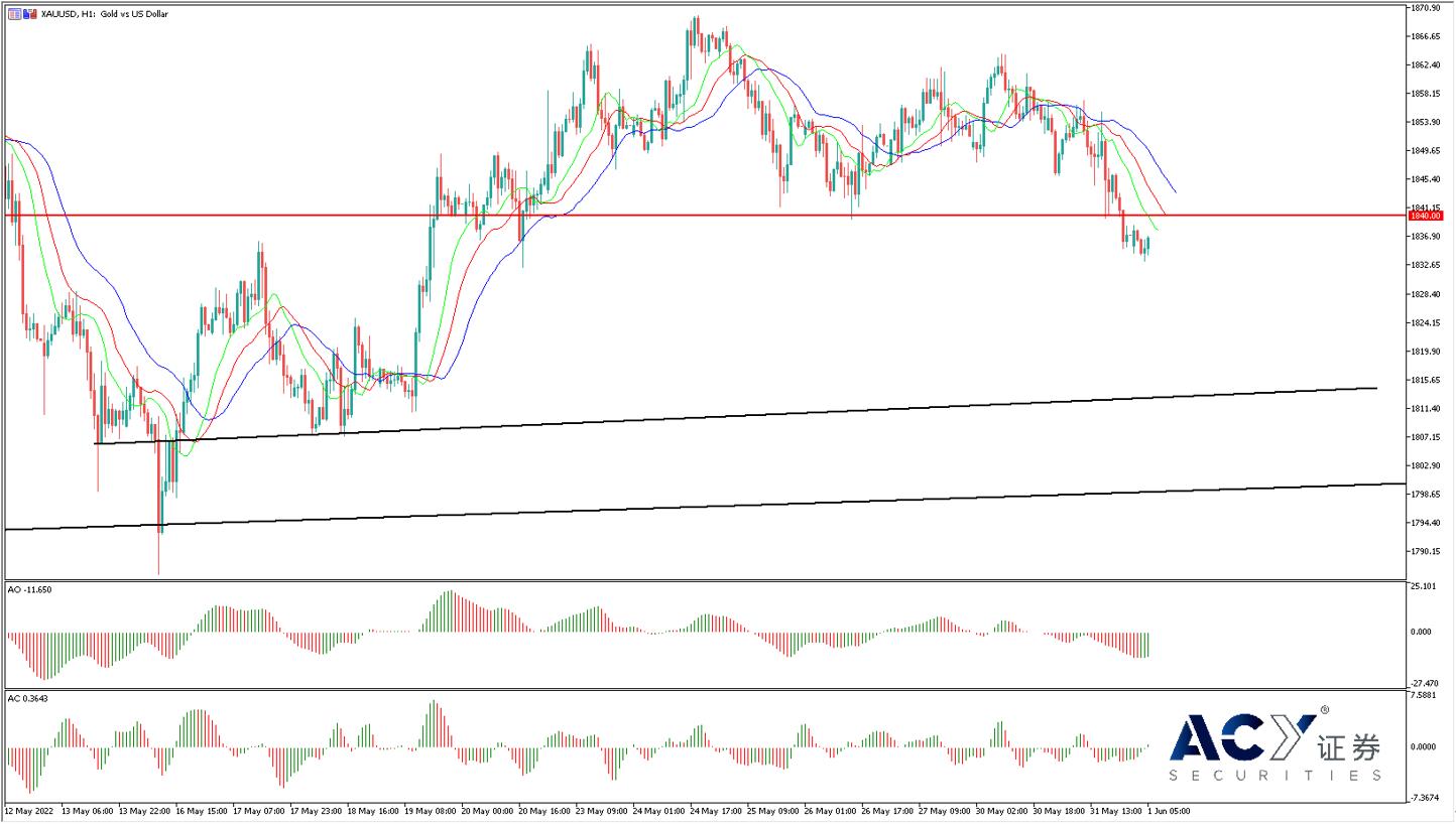 指标方面来看,鳄鱼线向下开口,K线还未触及唇线;AO柱线翻绿,AC柱线还未大涨,多头动能不够充足。日内空单入场可以配合AO柱线再度翻红,同时金价下穿1833的空头信号,以提高交易胜率。下方的短线支撑在1815趋势线和1800整数位元大关。