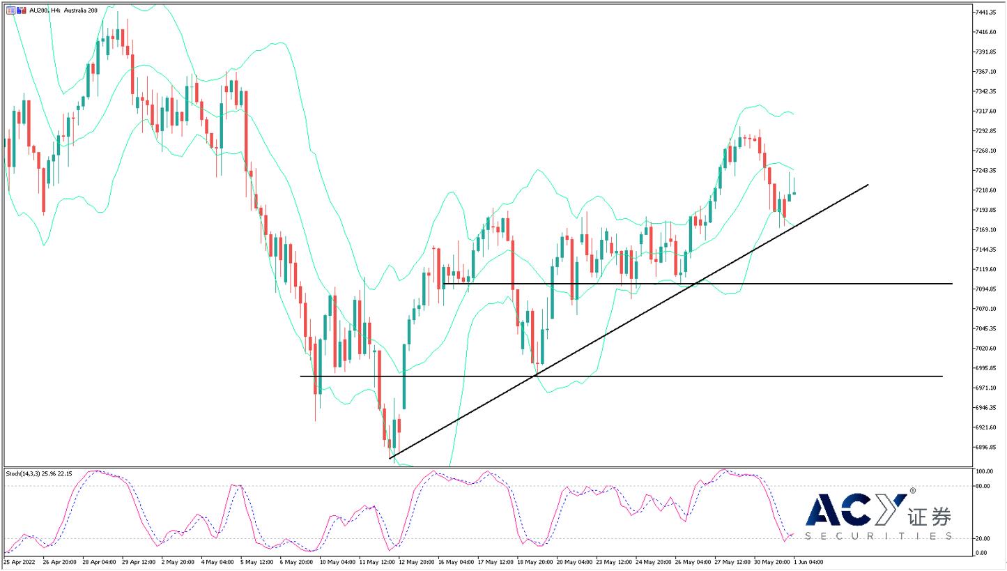 今日早盘,澳洲发布了一季度GDP资料,环比增长0.8%,同比增长3.3%。澳洲是近期少见的经济保持正增长国家,与不少欧美国家形成了鲜明的对比。因此在美元反弹之际,澳洲股指更加抗压。从澳指四小时图来看,指数已经开始稳定上涨,表现远好于纳指。材料、能源等板块已经先一步开始反弹,银行板块也逐步开始转强。考虑到美元压力,交易策略应该等待回调结束,再行入场多单。入场时机可以配合布尔带下轨与随机指标超卖区金叉信号,提高交易胜率。关键入场时机主要关注7100和7000两个整数字元大关。