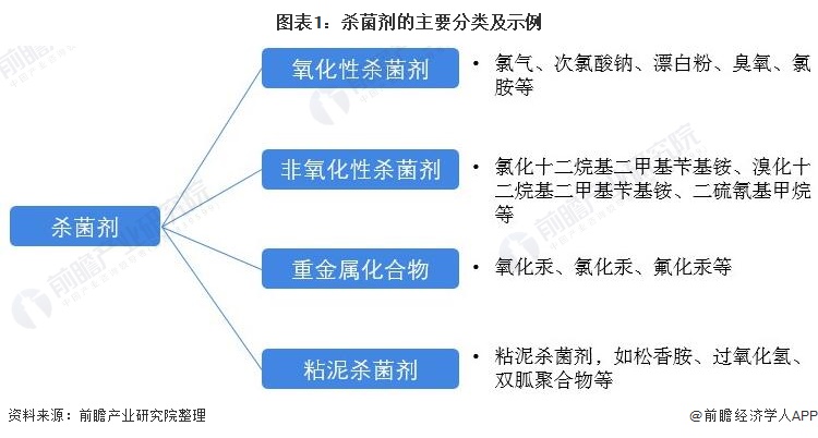 水处理杀菌剂又称杀菌灭藻剂、污泥剥离剂或抗污泥剂。一类能抑制水中菌藻和微生物的滋长,以防止形成微生物粘泥,对系统造成危害的化学药品。包括氧化性杀菌剂,如氯气、次氯酸钠、漂白粉、臭氧、氯胺等;非氧化性杀菌剂,如氯化十二烷基二甲基苄基铵、溴化十二烷基二甲基苄基铵、二硫氰基甲烷等;重金属化合物,如氧化汞、氯化汞、氟化汞等;粘泥杀菌剂,如松香胺、过氧化氢、双胍聚合物等。