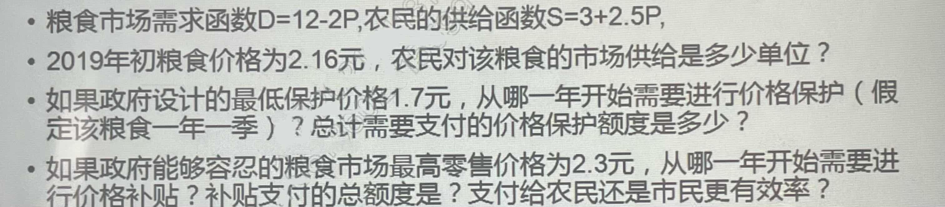而最高零售2.3元时 需求D 12-2*2.3=7.4,供给S 3+2.5*2.3=8.75. 容忍的最高售价下,产量多出了8.75-8=0.75. 针对这部分供给,需要补贴产生需求消化,则需要(2.3-2)*8+0.75*2.3=4.125(这个是边际的计算量,微观也有不同的理论不认可认为应该全价计算的)