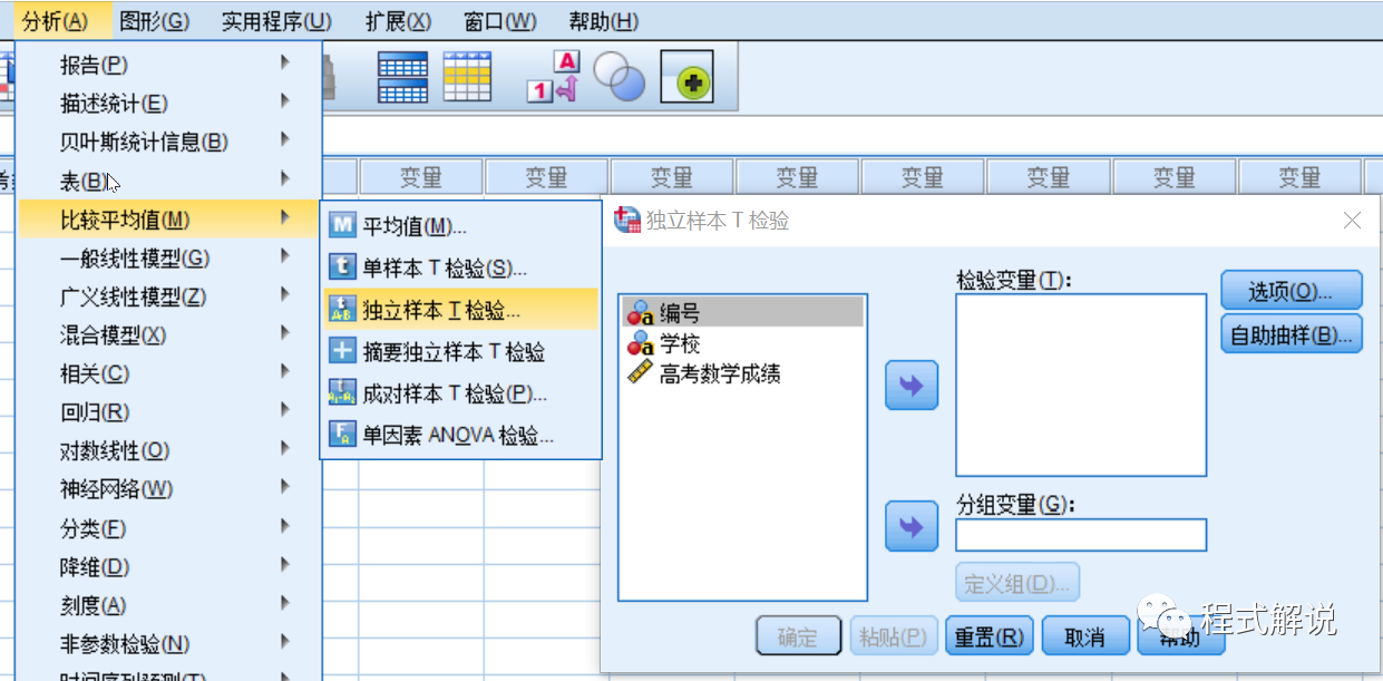 - 选择进行独立样本T检验的变量。在“独立样本T检验”对话框的左侧列表框中,选择“高考数学成绩”进入“检验变量”列表框。