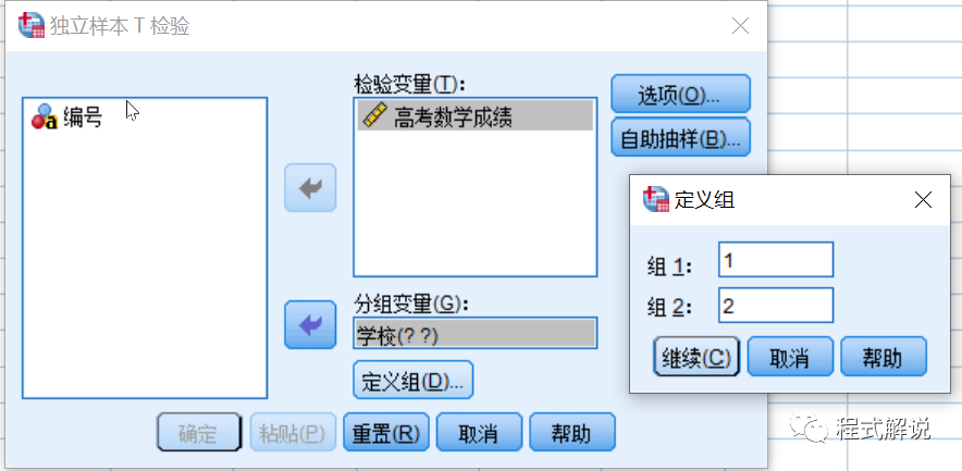 - 选择分组变量。在“独立样本T检验”对话框的左侧列表框中,选择“学校”进入“分组变量”列表框。然后单击“定义组”按钮,其中“组1”“组2”分别表示第一、二组类别变量的取值。在“组1”中输入1,在“组2”中输入2。