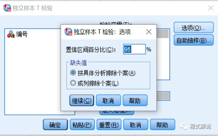 - 置信区间和缺失值的处理方法。单击“独立样本T检验”对话框中的“选项”按钮,在“置信区间百分比”文本框中输入“95”,即设置显著性水平为5%。在“缺失值”选项组中选中“按具体分析排除个案”单选按钮,单击“继续”按钮,返回“独立样本T检验”对话框。