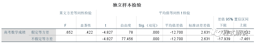 2. 独立样本T检验结果表F统计量的值是0.652,对应的置信水平是0.422,说明两样本方差之间不存在显著差别,采用的方法是两样本等方差T检验。T统计量的值是-4.827,自由度是78,95%的置信区间是(-17.938,-7.462),临界置信水平为0.000,远小于5%,说明两所学校被调查的高三学生的高考数学成绩之间有着明显的差别。