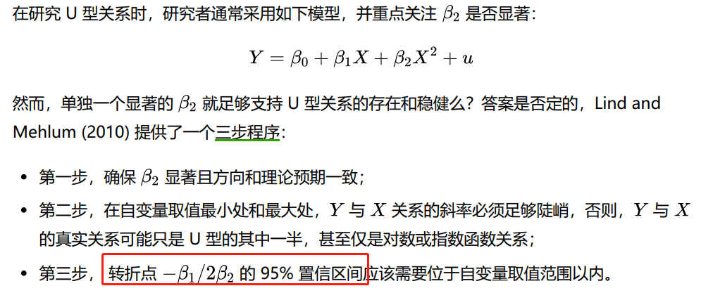 连玉君老师关于U型关系的文章中说验证U型关系成立其中需要“抛物线对称轴的95%置信区间在自变量的取值范围内”。