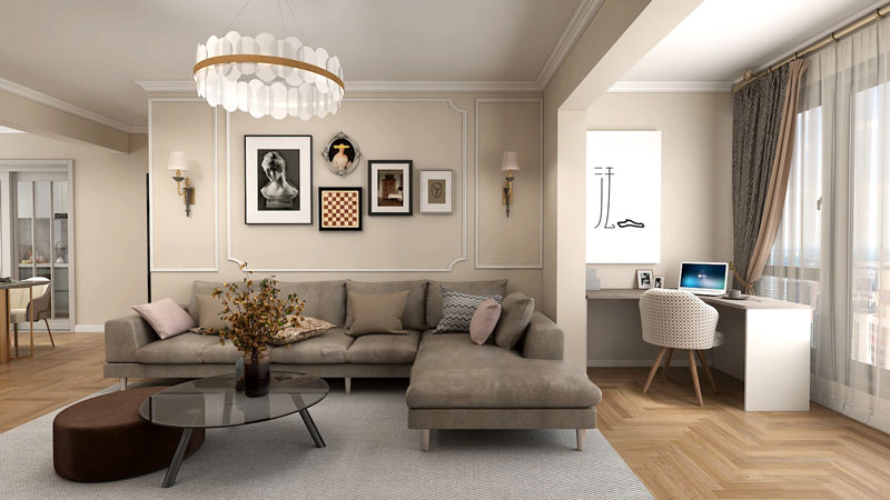 经典配饰的衬托,能进一步诠释法式的味道,装修风格的协调离不开壁画、灯具(吊灯和壁灯等)、绿植、地毯等各种细节的配饰装饰。我们可以选择有艺术感,氛围感,层次感的壁画,灯具的光线要更加柔和,可以营造浪漫的气氛;地面铺上几张地毯,但图案和色彩不能过于花俏,简约为主。