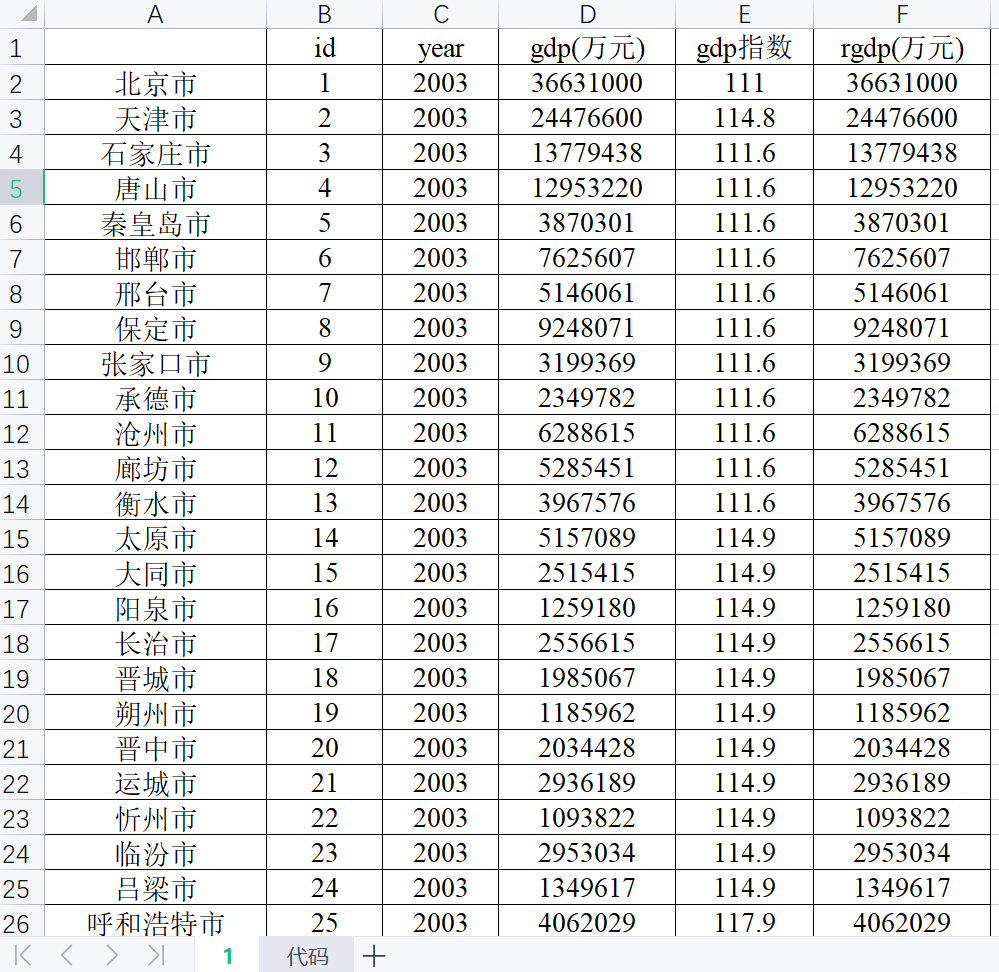 数据包含:地级市、id、year、gdp、gdp指数和rgdp等六个数据字段,共涉及285个地级市的相关GDP数据。