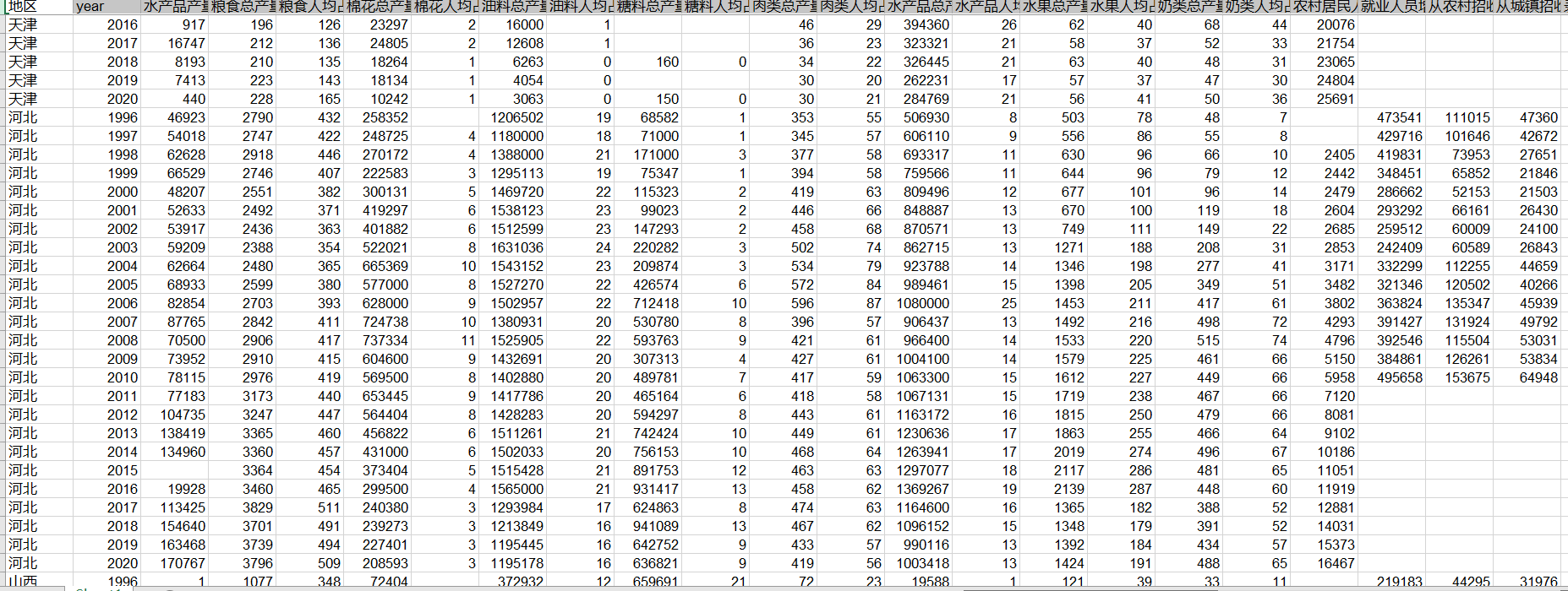 三农数据(1996-2020)五:农产品产量、就业人数、农村养老等.dta