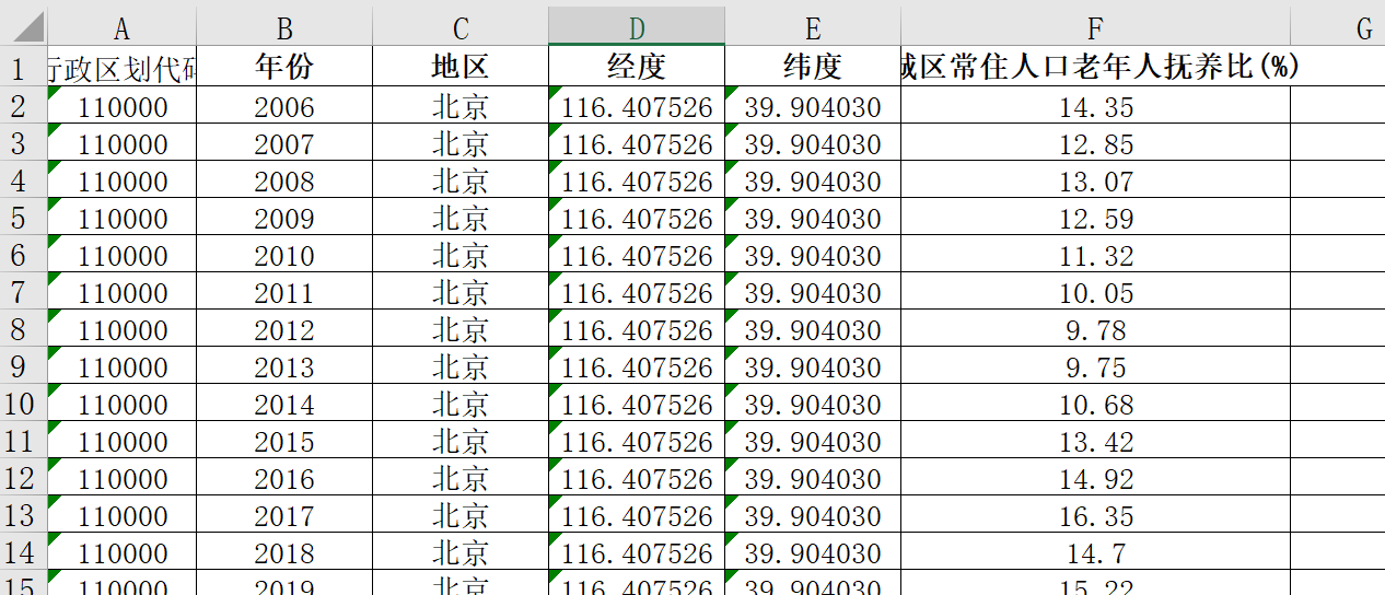 行政区划代码、年份、地区、经度、纬度、城区常住人口老年人抚养比(%)...