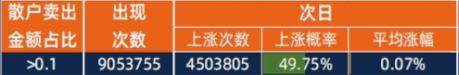 这张表统计了散户卖出金额占比大于10%的情况在历史上共出现905万次左右,其中在次日上涨的次数大概是450万次,上涨的概率是49.75%,平均涨跌幅是0.07%,跟抛硬币相差无几。