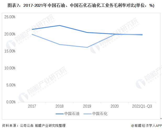 从石油化工业务的毛利率来看,2017-2020年,中国石油的石油化工业务毛利率均高于中国石化;从毛利率变化趋势来看,中国石化的毛利率呈先降后升趋势,而中国石油的毛利率波动下降。2020年,两家龙头石油化工企业的石油化工业务毛利率差距较小。中国石油毛利率为20.02%,中国石化毛利率为19.83%。