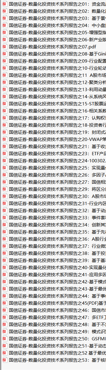 国信证券数量化投资技术系列报告整理汇总,当前还差两篇22、28,大家有的话欢迎共享交换哈