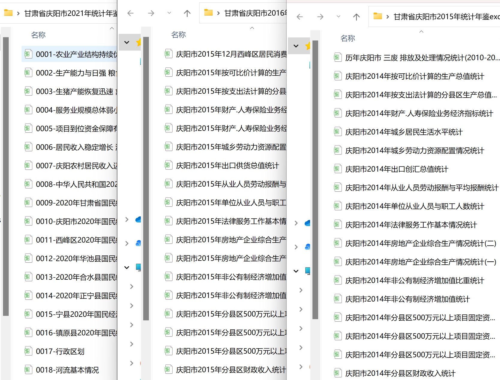 一共有三年的甘肃省庆阳市统计年鉴数据,包括2015年、2016年和2021年,都是Excel版,部分内容截图如下