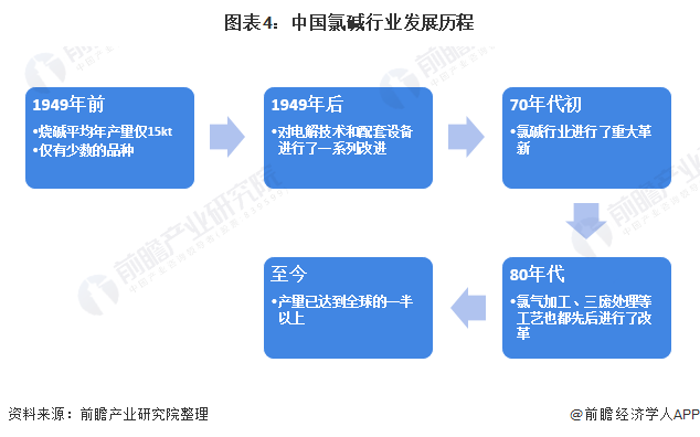 中国氯碱行业始于20世纪20年代末;在1949年前,氯产品仅盐酸、漂白粉、液氯等少数品种。1949年后,在提高设备生产能力的基础上,对电解技术和配套设备进行了一系列改进。在20世纪70年代初,氯碱行业中阳极材料进行了重大革新,开始在隔膜槽和水银槽中用金属阳极取代石墨阳极。在20世纪80年代,氯碱行业中的蒸馏设备、碱液蒸发,以及氯气加工、三废处理等工艺也都先后进行了改革。如今,我国氯碱产量已达到全球的一半以上。