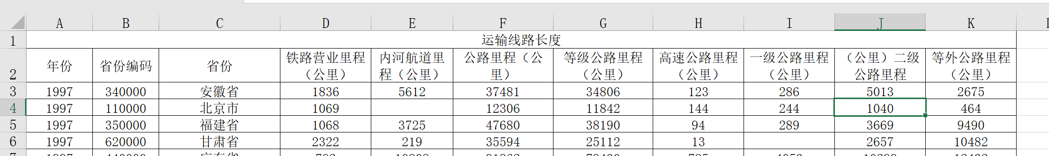 指标包括:铁路营业里程(公里)、内河航道里程(公里)、公路里程(公里)、等级公路里程(公里)、高速公路里程(公里)、一级公路里程(公里)、(公里)二级公路里程、等外公路里程(公里)
