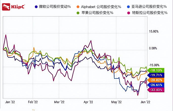 据数据显示,2022年微软股价下跌了20%,特斯拉跌幅达33%。亚马逊下跌了27%,Alphabet下跌了21%。
