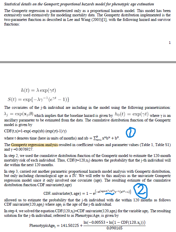 请问有没有做生存分析或者懂Gompertz模型的大神,我在读文献时遇到个问题:这篇文章里用一些临床特征来计算一个所谓的表型年龄(phenotypic age),大概过程是将临床特征放到一个Gompertz模型里做生存分析,然后假设phenotypic age也满足这个模型,从而求解出phenotypic age,原文具体步骤见: