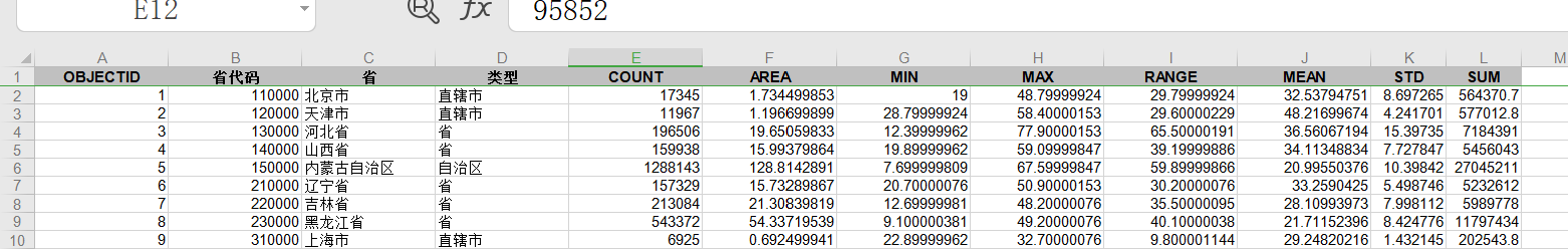 COUNT、AREA、MIN、MAX、RANGE、MEAN、STD、SUM