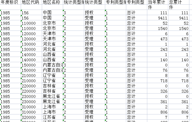 StatisticalType [统计类型] - 申请;受理;授权。2010年前未区分受理与申请,均为受理;申请量自2010年披露,无总累计值。