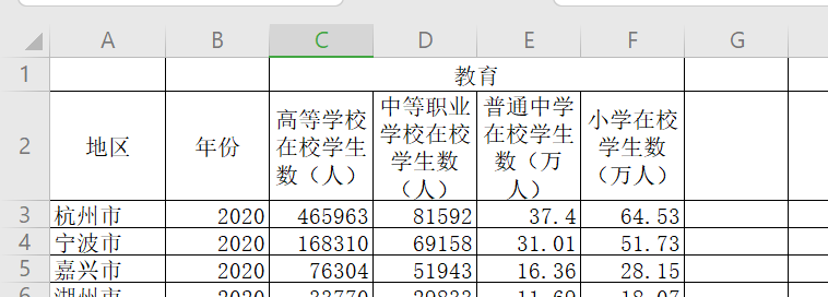 1、指标包括:高等学校在校学生数(人)、中等职业学校在校学生数(人)、普通中学在校学生数(万人)、小学在校学生数(万人)