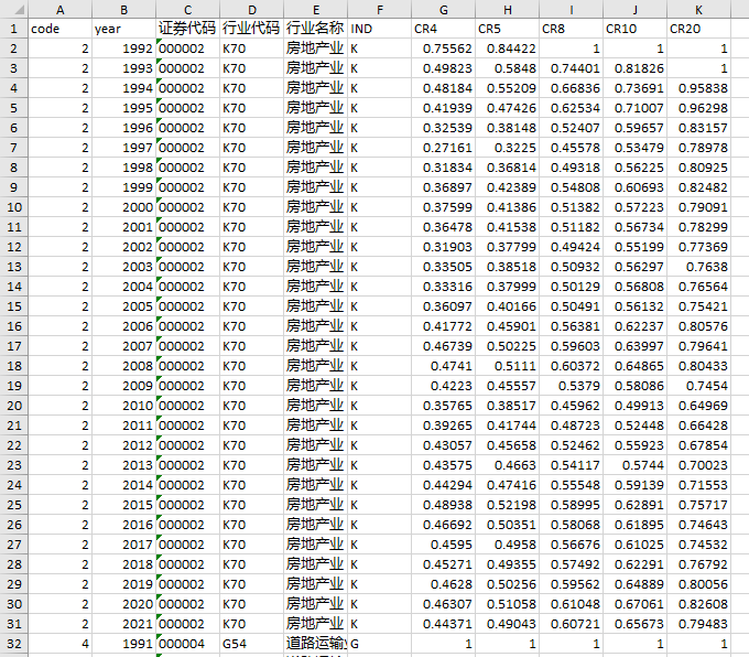 数据样例(行业集中度(制造业用二级行业分类,其他用一级分类来计算)):