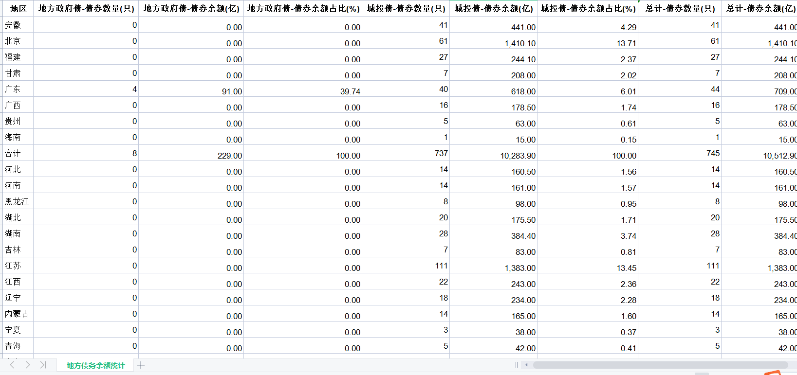 地方ZF债-债券数量(只)、地方ZF债-债券余额(亿)、地方ZF债-债券余额占比(%)、城投债-债券数量(只)、城投债-债券余额(亿)、城投债-债券余额占比(%)、"总计-债券数量(只)、"、总计-债券余额(亿)、GDP、公共财政收入、公共财政支出、债务负担(%)、负债率(%)、财政自给率(%)